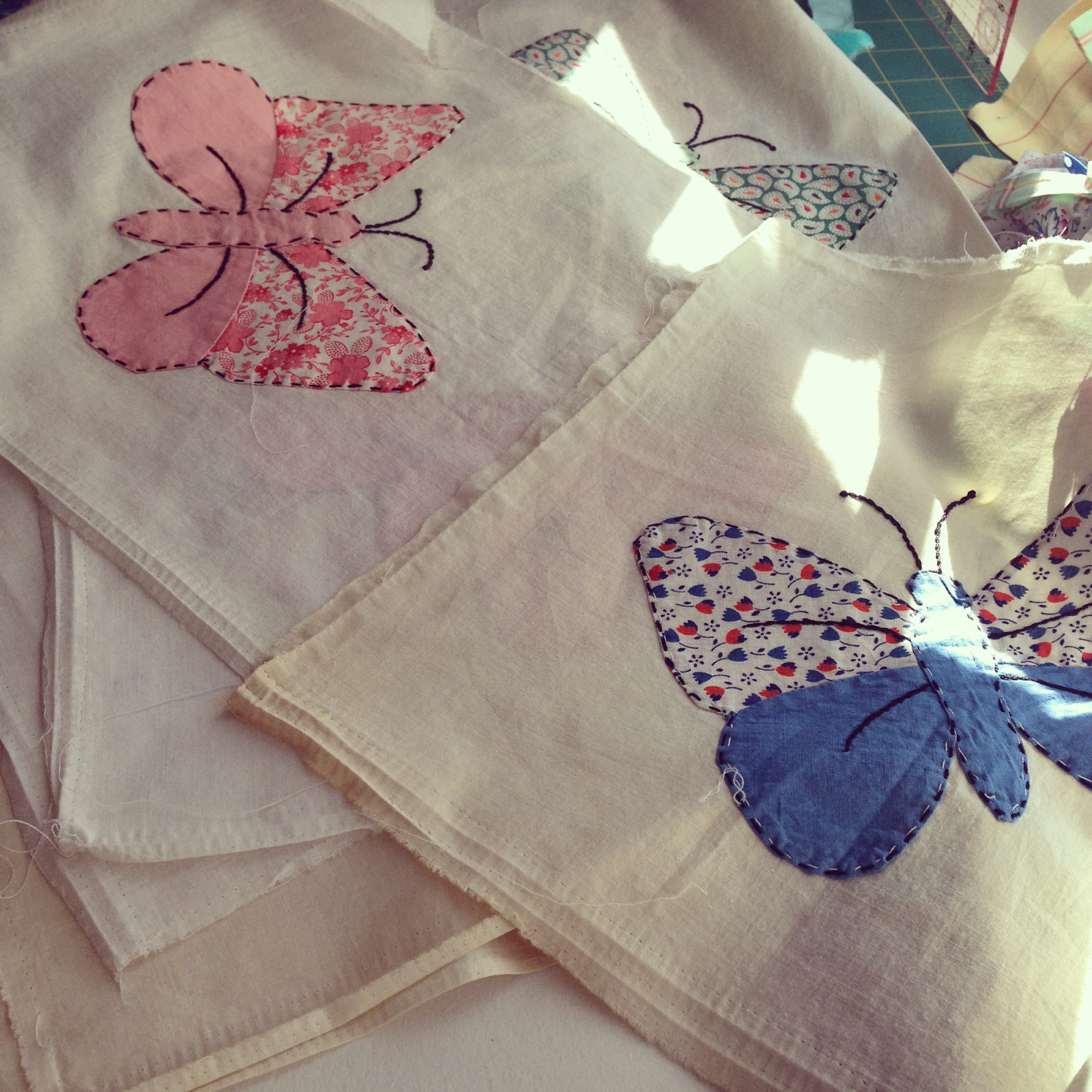 The quilt is a medallion style and has narrow borders around the grouped butterflies. The hand quilting design consists of more butterflies, scattered throughout the plain areas. It is finished with a pretty scalloped edged, which was a popular binding from this era. Some of the fabrics used, which may have been feed sacks, are completely faded away, others have frayed and some have remained in quite good condition with only some loss of their bright colours. This would be a lovely quilt to reproduce, but I think I will just enjoy it for a few more years to come. It looks very pretty folded on an old cane armchair. Enjoy the butterflies, Janette