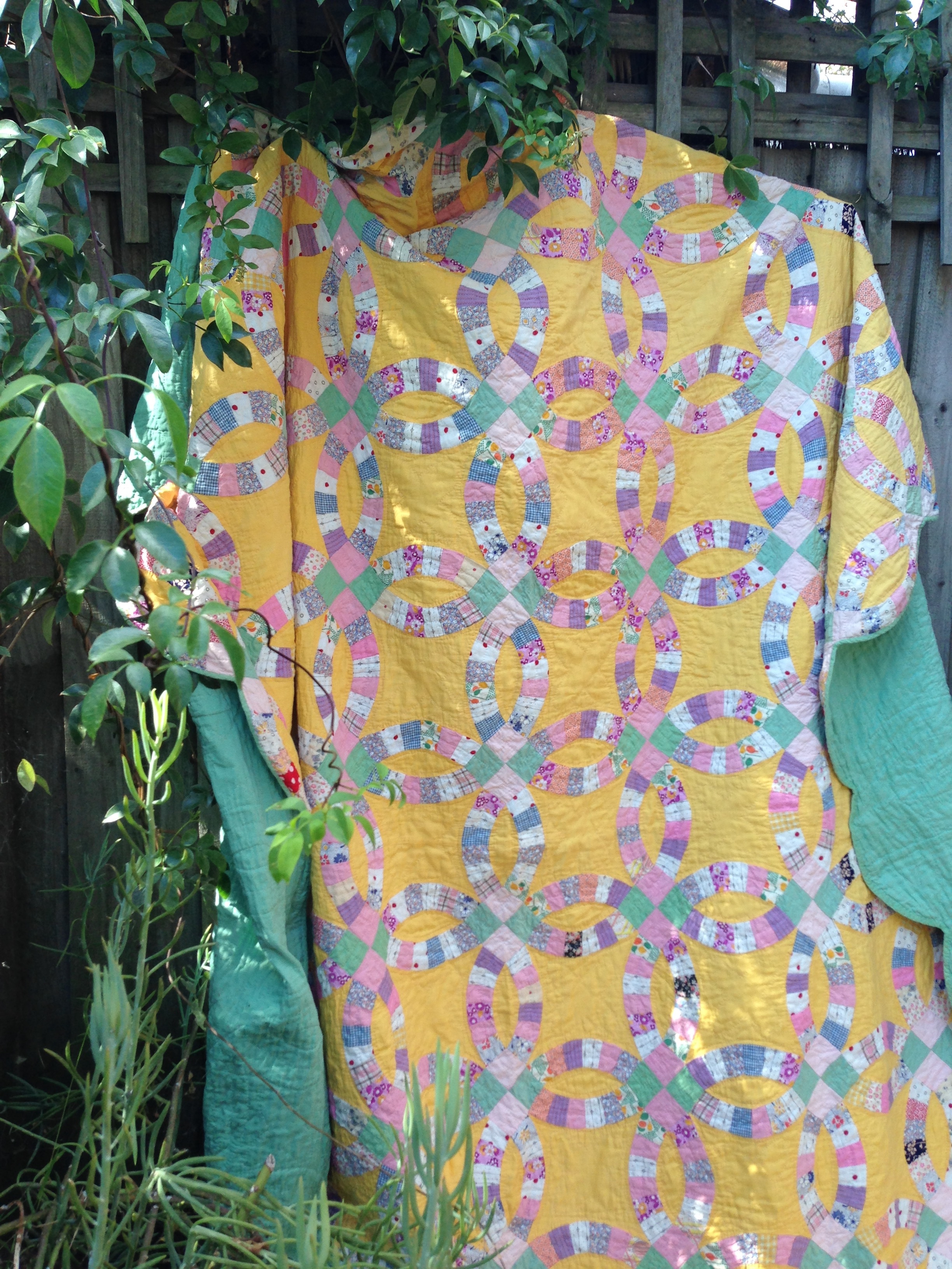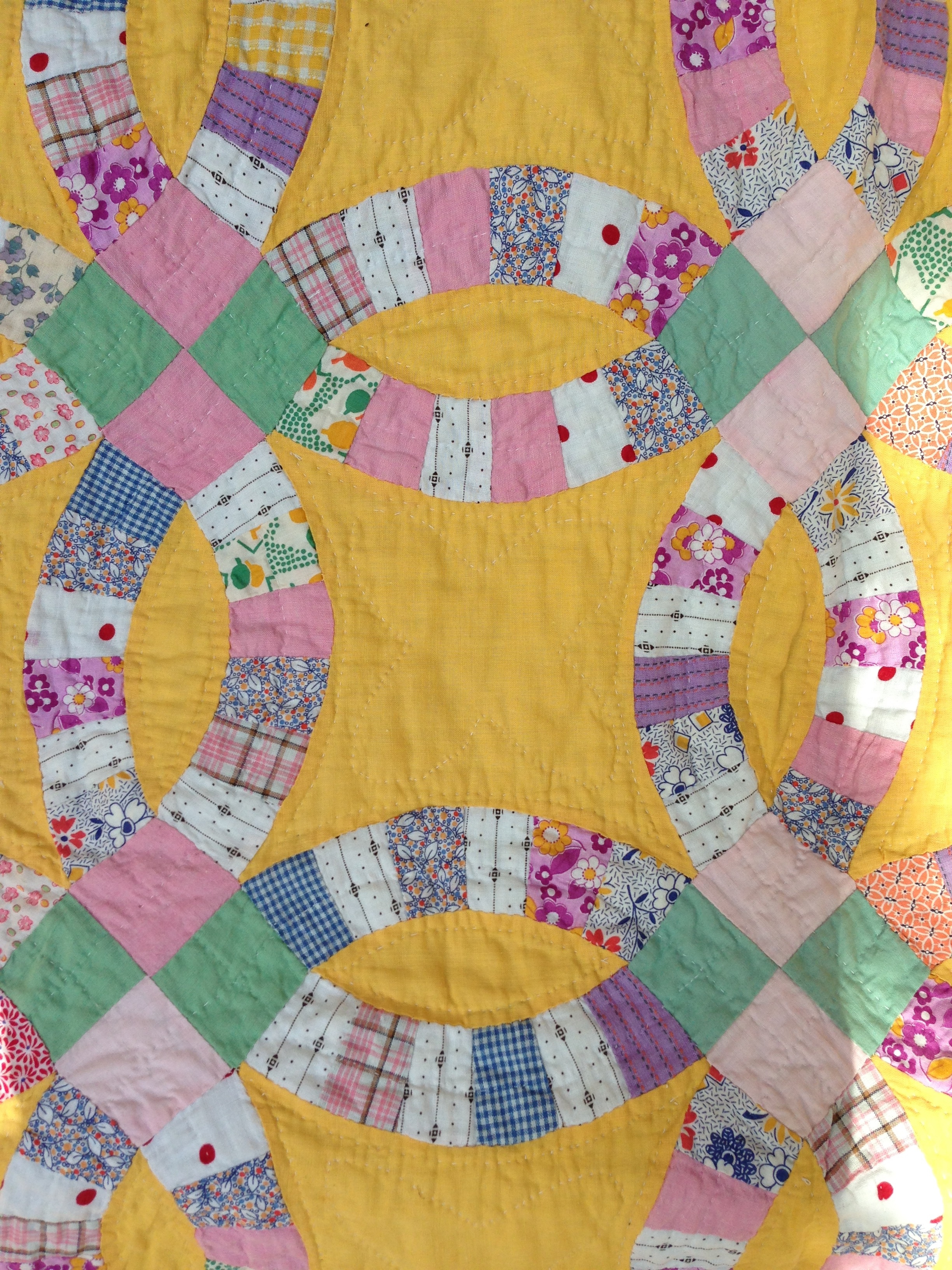 Another example of a 1930s Wedding Ring can be seen in this quilt fragment. A notable feature of this quilt is the use of Prairie Points to finish off the curved edges. The arcs consist of seven pieces and are set with pink and green patterned fabrics. The quilting was done in the Hanging Diamond pattern. I love this little fragment and can only wonder at what an exquisite quilt it must have been.