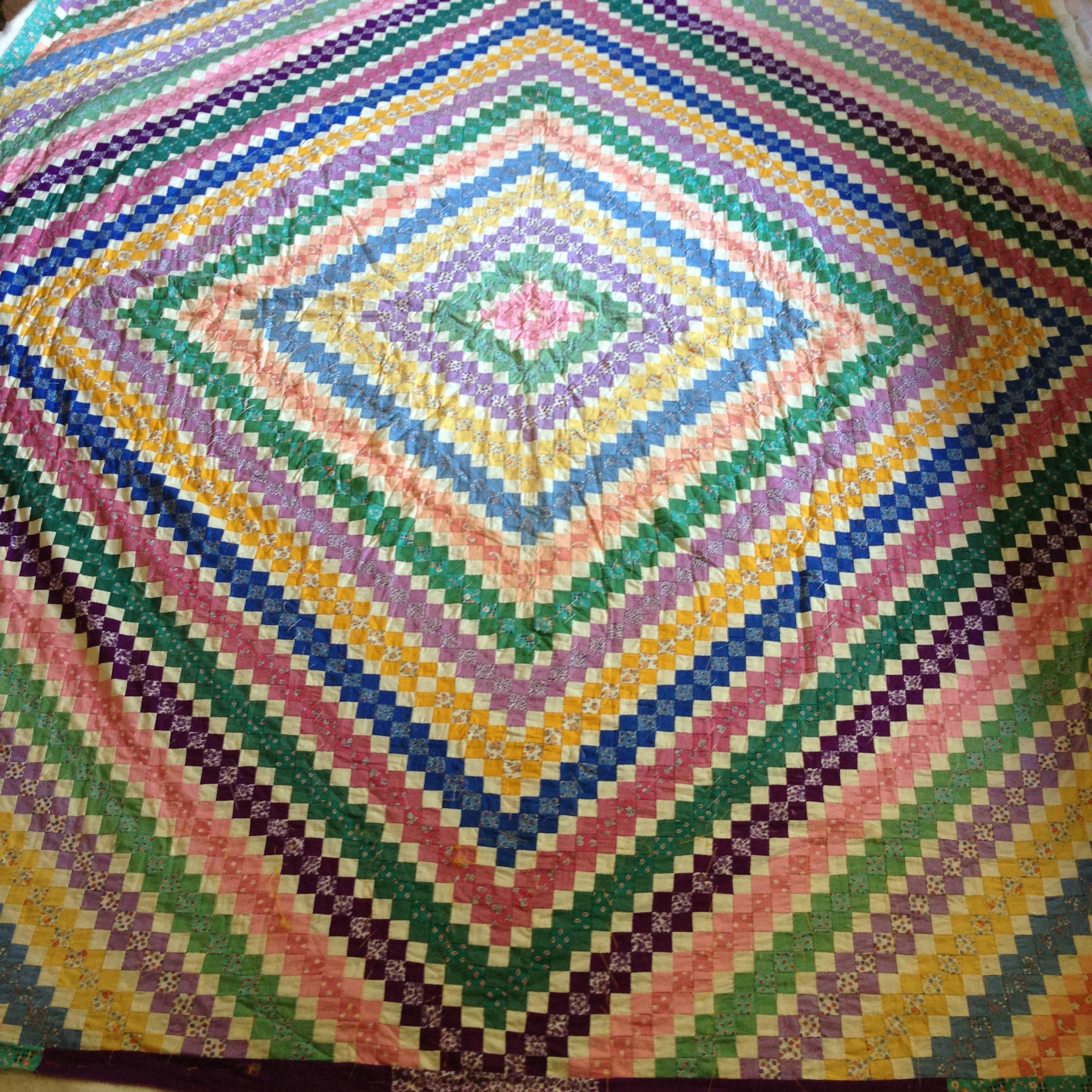 My quilts represent examples of both these designs. In the book ‘The World of Amish Quilts’ by Rachael and Kenneth Pellman. The Pellmans state that this arrangement of squares was a favoured design predominantly made in Lancaster County, PA. from where it spread to other Amish settlements. The Amish call this design Sunshine and Shadows. These quilts were made in solid colours and nearly always featured at least one large border. It is also stated that ‘the squares are arranged by colour to form a series of brightly coloured expanding diamonds. Sometimes the squares are tipped on point to form a pattern of squares. The Pellmans also state the ‘the Sunshine and Shadow arrangement of squares worked in printed fabrics rather than plain, may be called Trip Around the World and is often made by non-Amish women’.