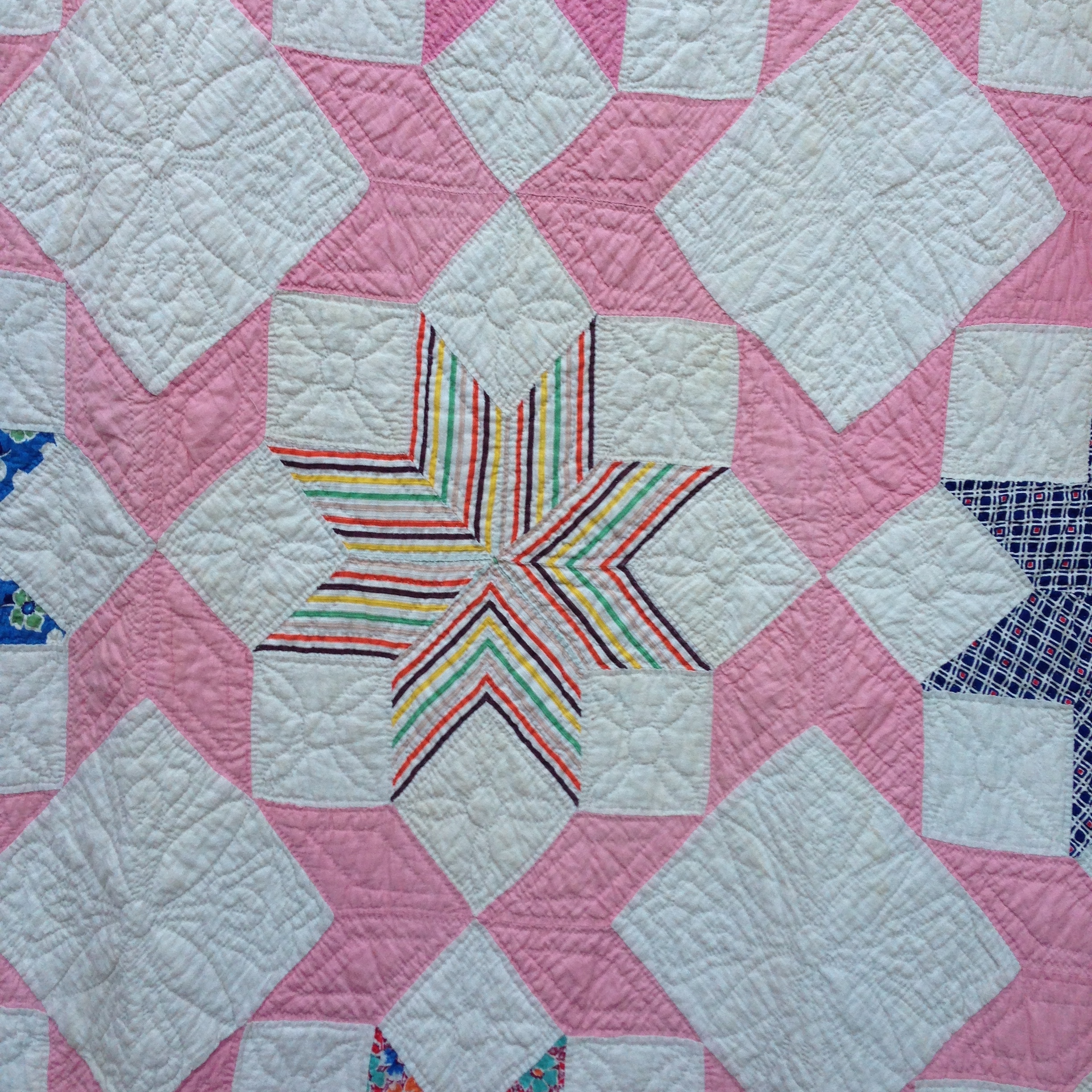 The delightful variety of fabrics used by the quilt maker include seersuckers, feed sacks, polka dots, stripes, plains and geometrics. The 20 blocks making up the quilt are all artistically brought together with the pretty pink solid and the feedsack background fabric. The quilt’s backing is also plain, open weave feedsack fabric with the Kansas Flour Mill logo faintly visible. There are also some neat repairs on the back where some patching was done before quilting.