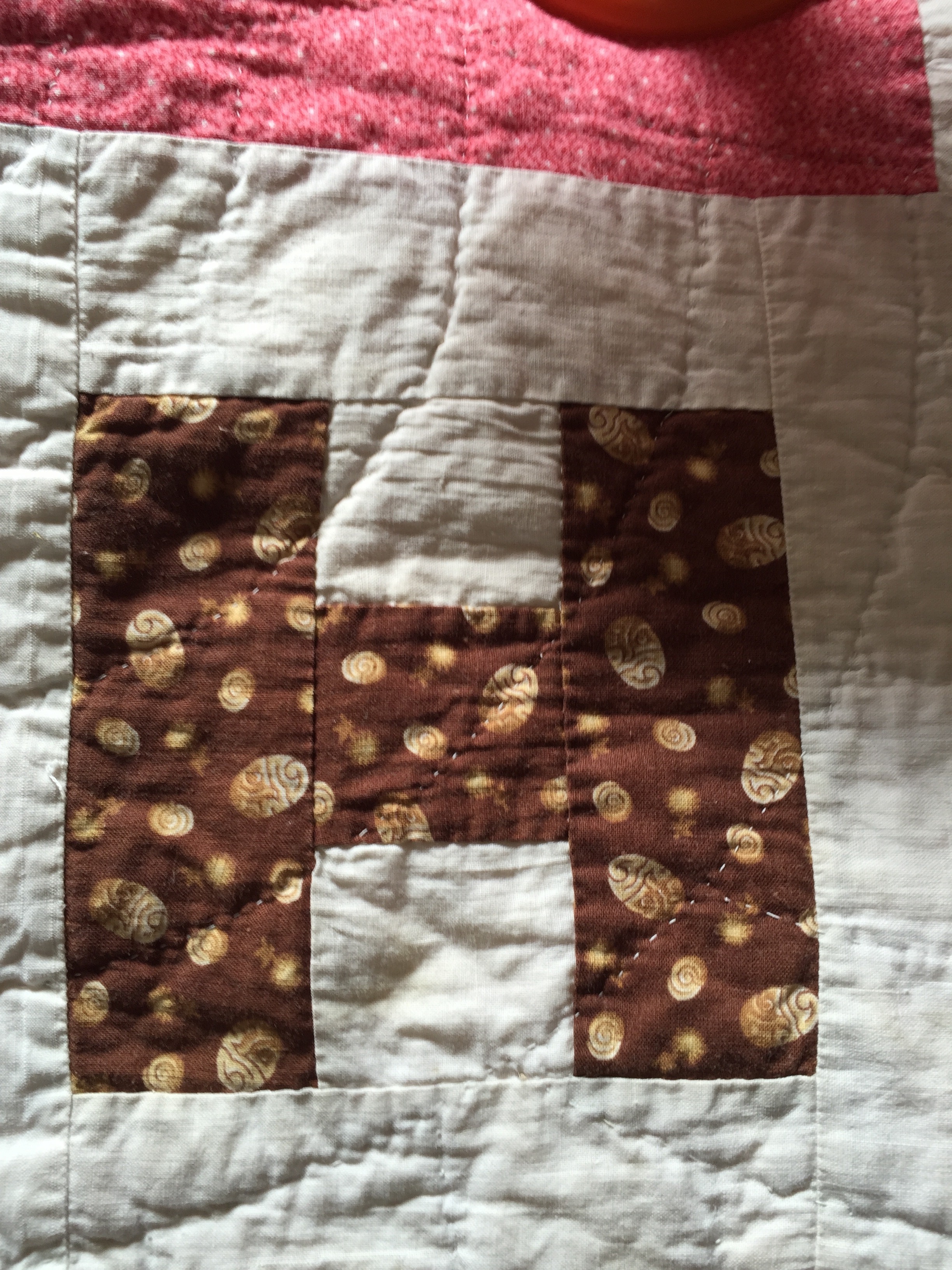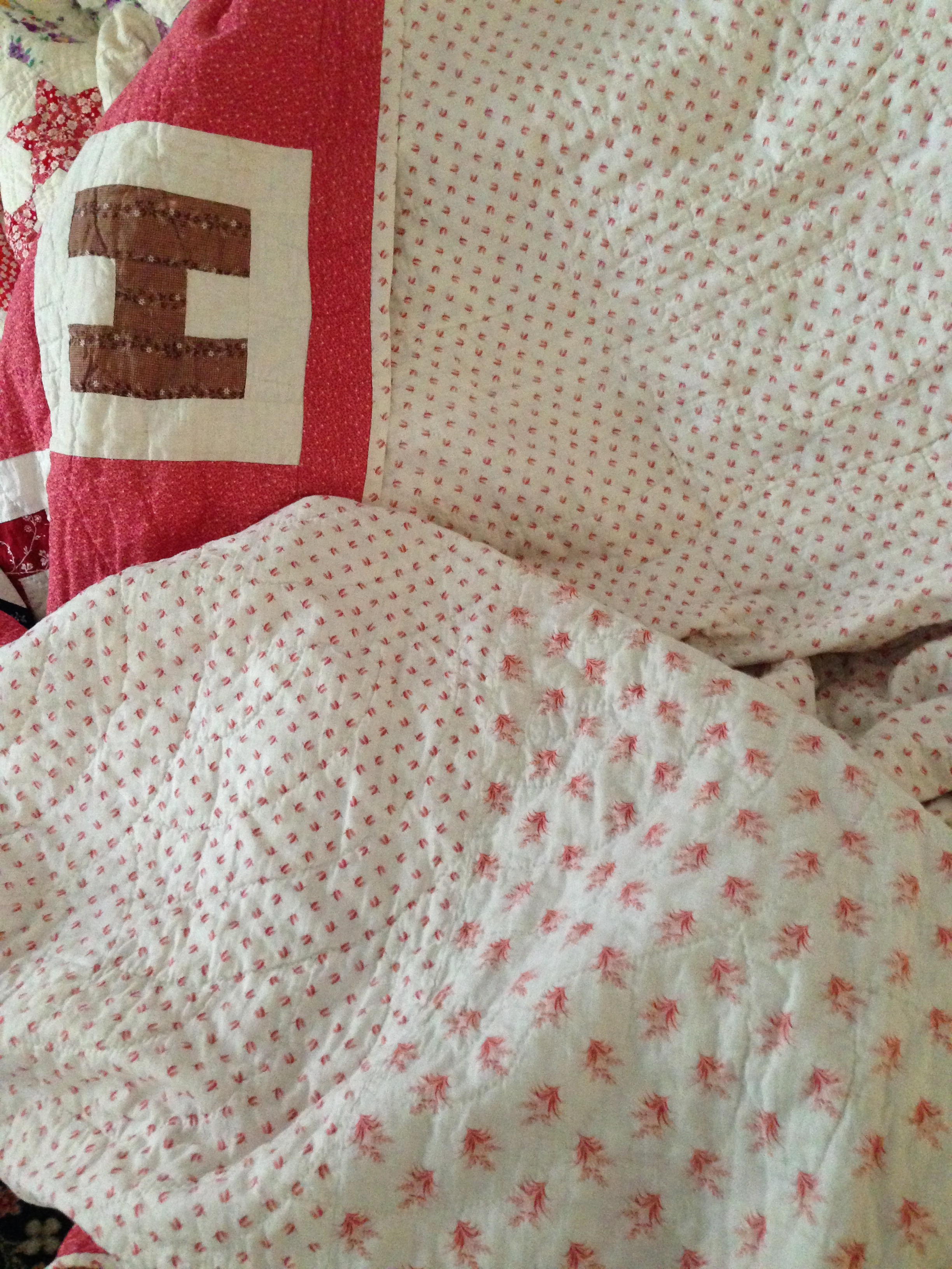 The Letter H quilt dates to about the late 1890s to 1910. The Letter H blocks were probably made from the quilter’s scrap basket. The cream background fabric in the blocks is consistent throughout, as is the gorgeous double pink used for the alternate blocks.
