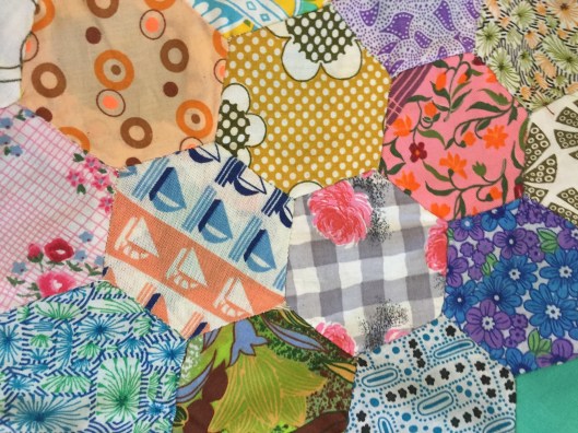 I attempted a hexagon quilt in 1973 having found a pattern in an English Womens’ Weekly magazine. I used scraps from dressmaking and fabric cut off from shortening hems of bought clothes. The Mini skirt being the fashion of the time. This piece remains unfinished but it is interesting for the fabrics it contains.