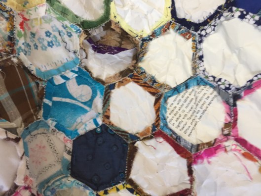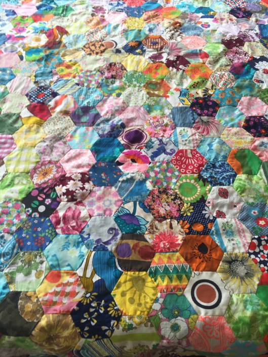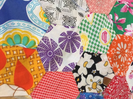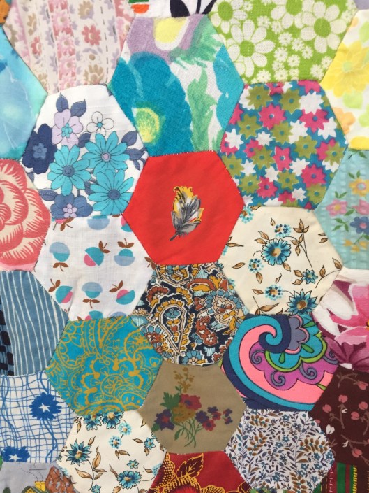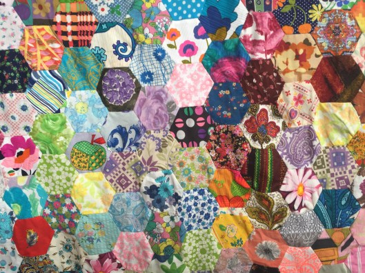 I attempted a hexagon quilt in 1973 having found a pattern in an English Womens’ Weekly magazine. I used scraps from dressmaking and fabric cut off from shortening hems of bought clothes. The Mini skirt being the fashion of the time. This piece remains unfinished but it is interesting for the fabrics it contains.
