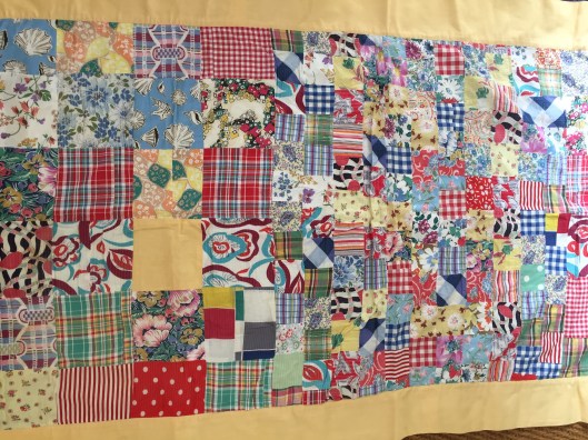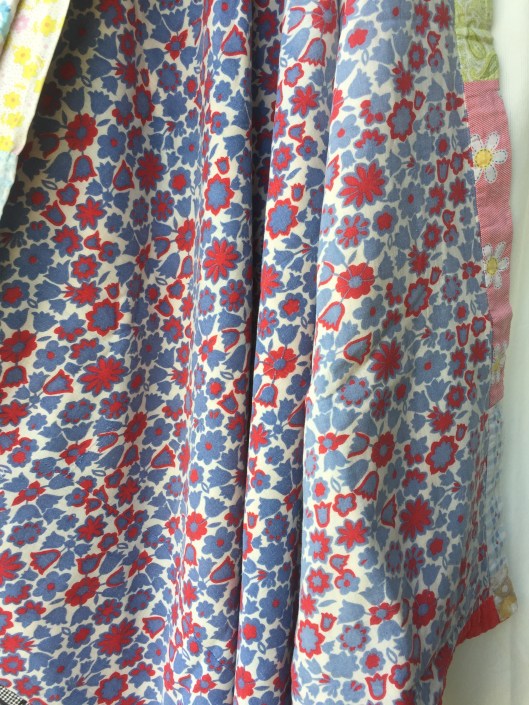 The quilt contains a wonderful array of 1930s dressmaking fabrics and probably some feedsacks.