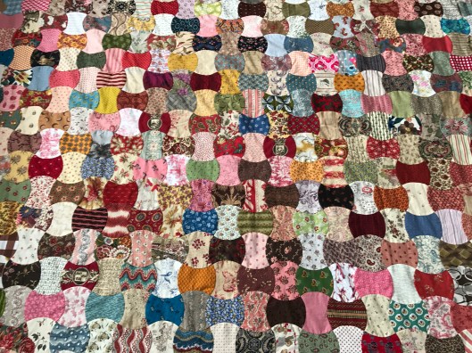 The maker of this quilt was certainly a skilled needlewoman. The quilt is constructed of 323 full ‘windows’ and 72 ‘half windows’ which are stitched in a solid pink. These create a border around the outside edges.